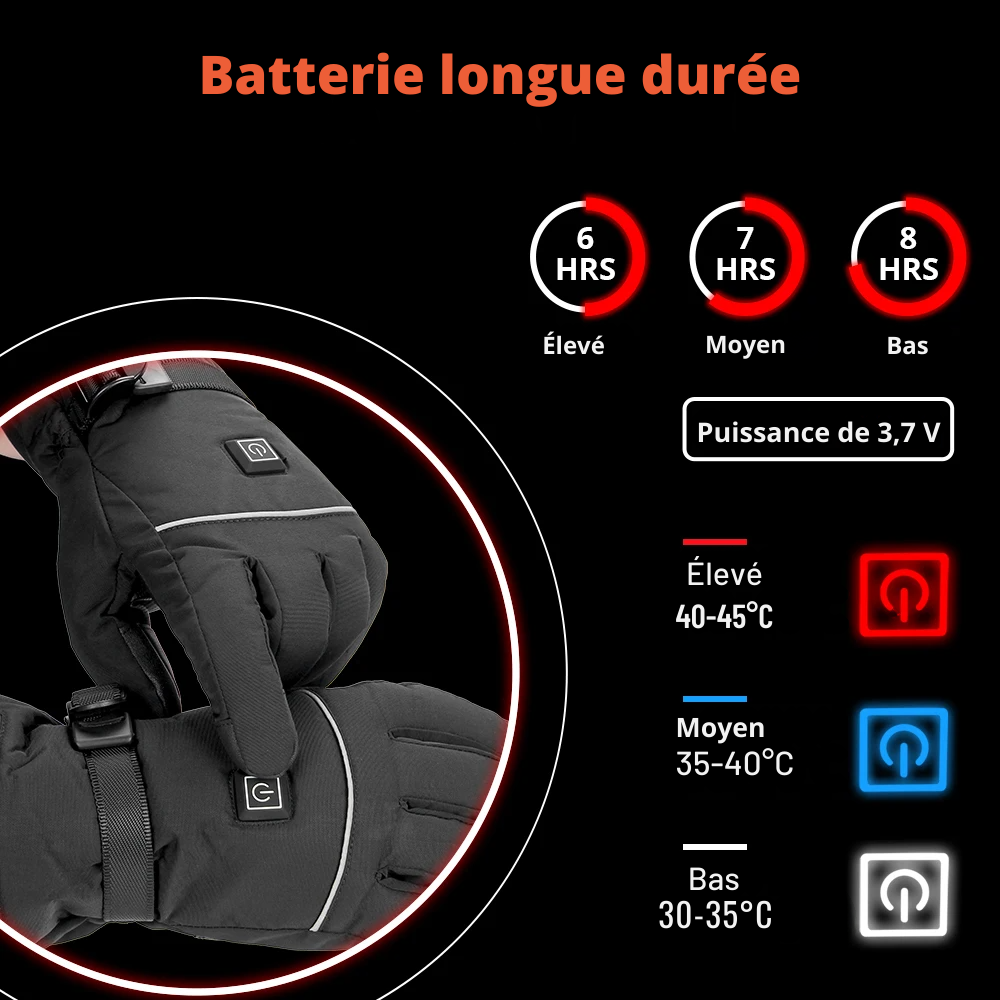 Superbes gants chauffants! Ils sont confortables, bien isolés et je peux utiliser mon smartphone sans problème grâce à la fonction tactile. La batterie tient vraiment bien, même lors de longues journées dehors.